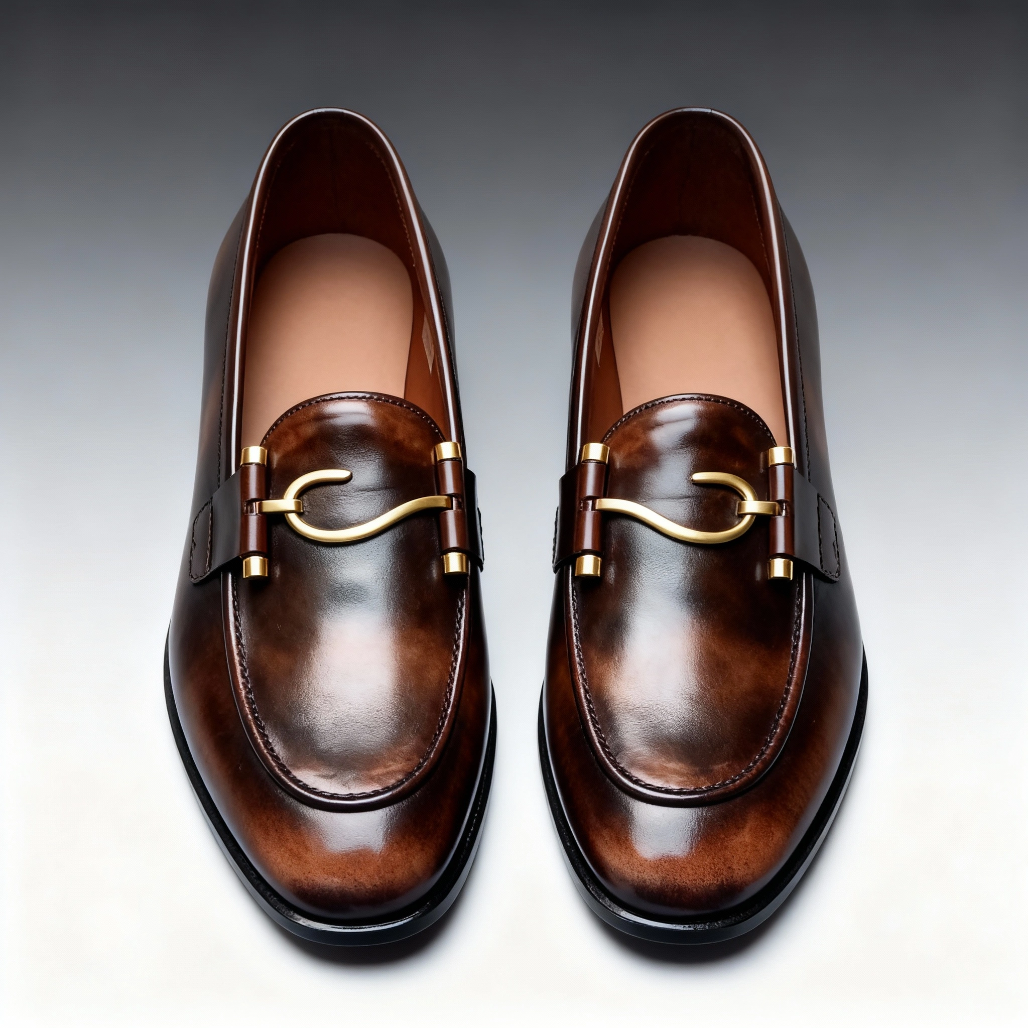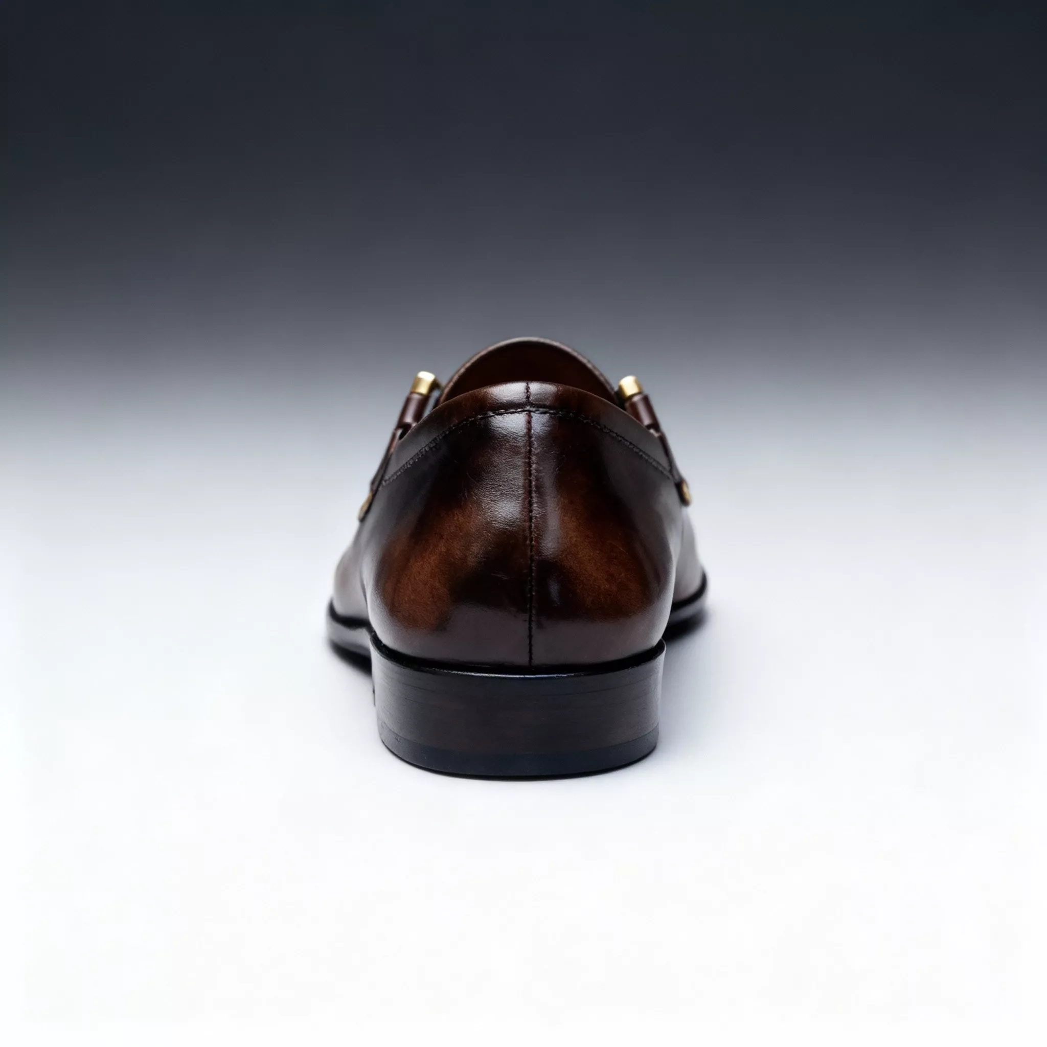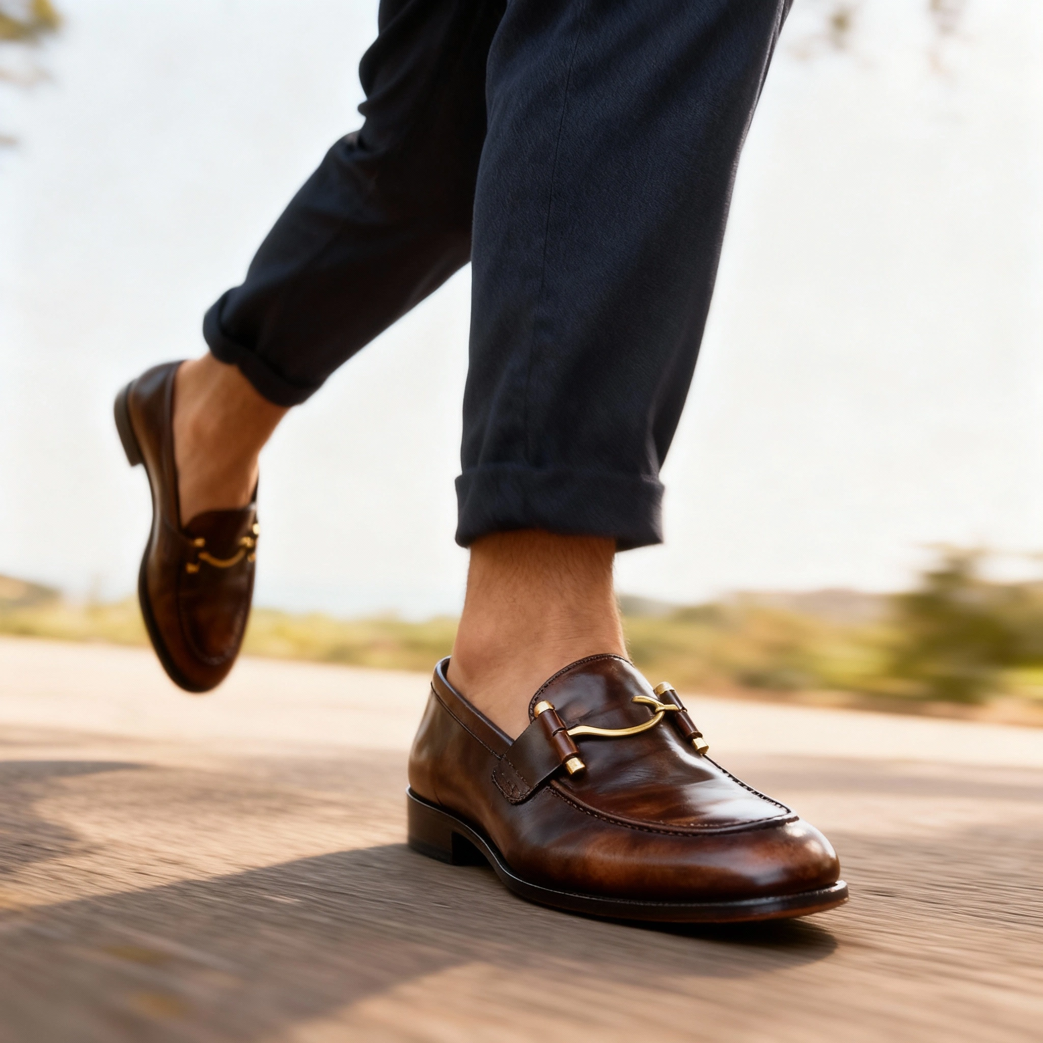 Experience timeless elegance with handcrafted leather shoes in Pakistan from Royal Moccs shoes. The Belmont is a premier example of premium leather shoes, meticulously handmade from the finest full-grain genuine leather. This stylish brown leather shoe features a classic apron toe and an iconic polished gold horsebit, finished in a vibrant, sun-drenched cognac brown that radiates sophistication.