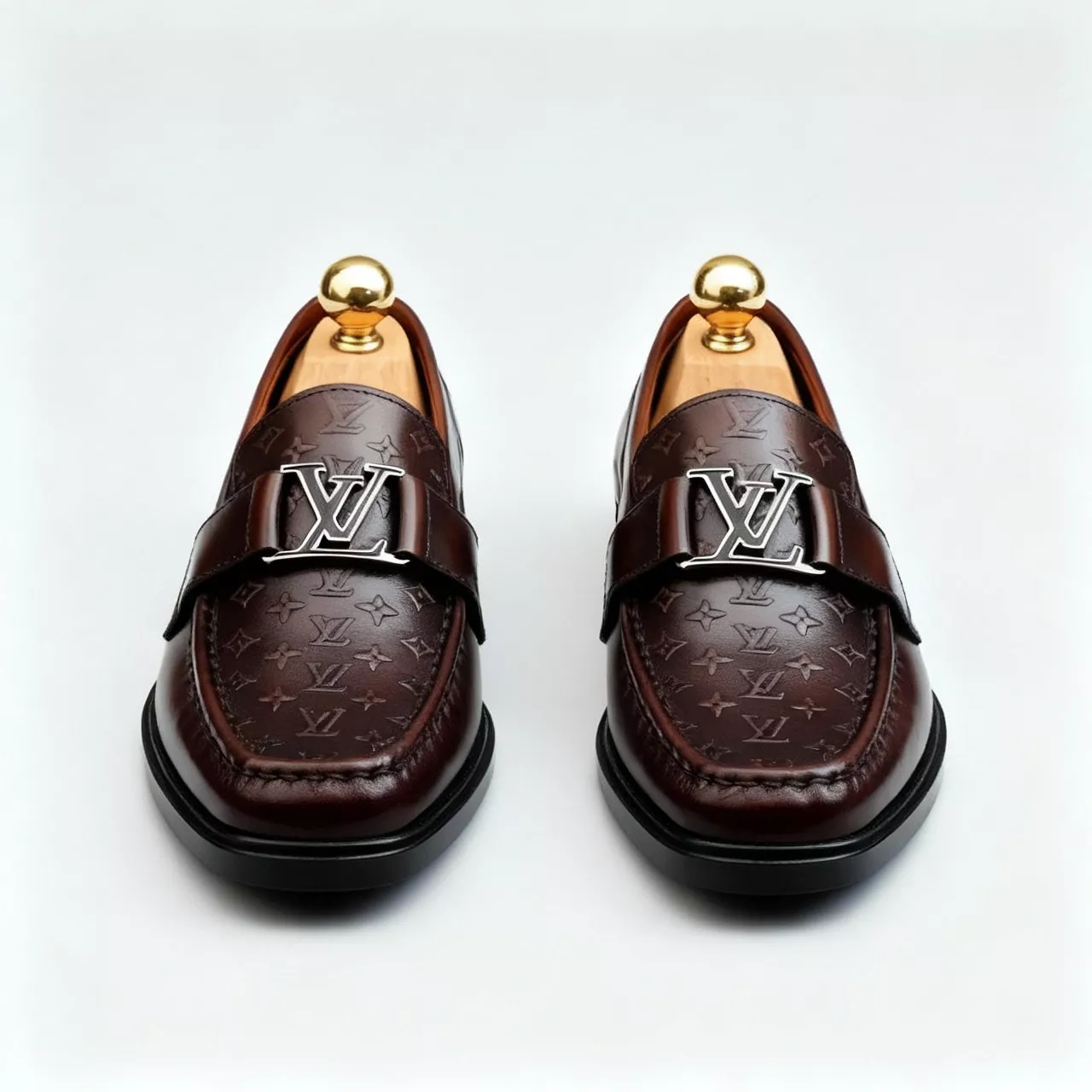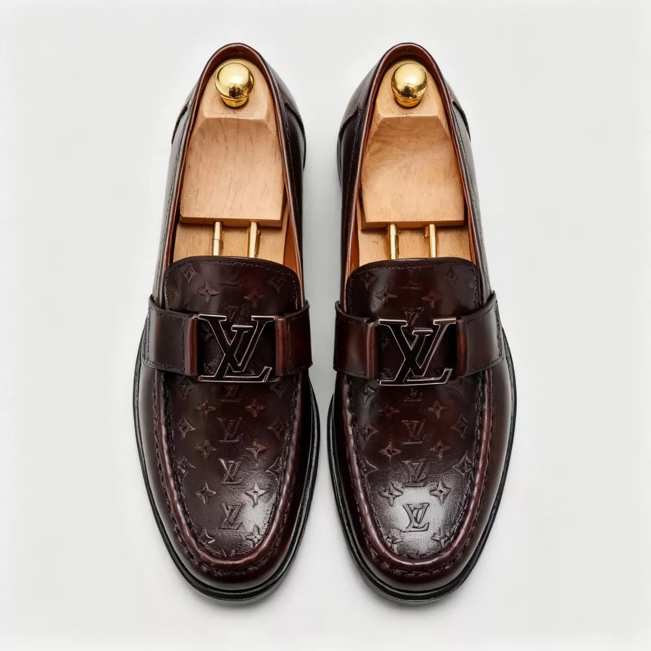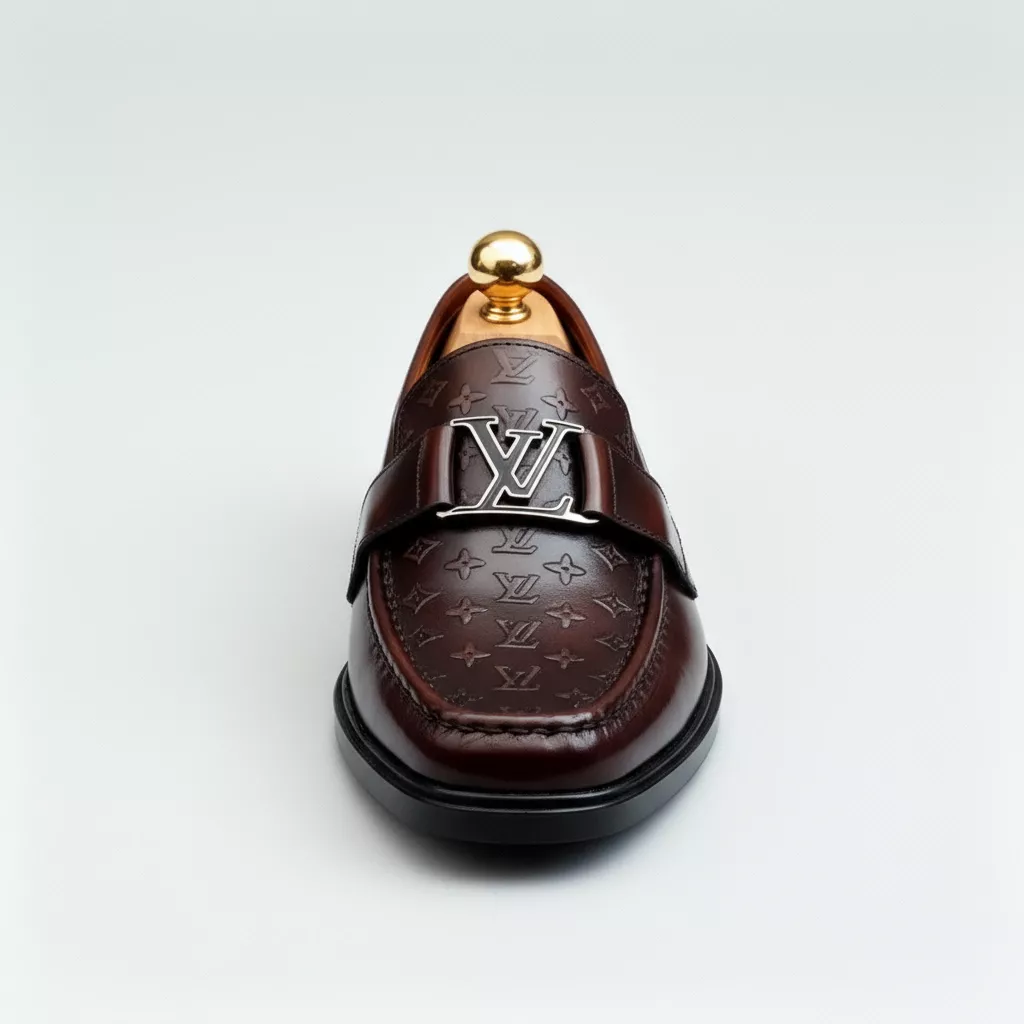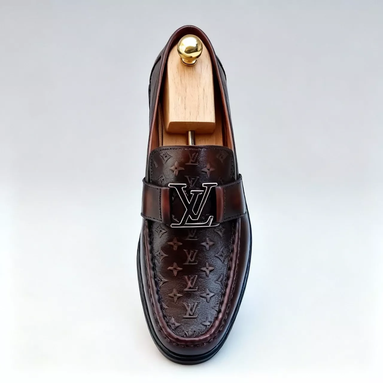 Experience luxury with handcrafted leather shoes in Pakistan from Royal Moccs shoes. The Imperial Monogram Loafer is a premier example of premium leather shoes, meticulously handmade from the finest full-grain genuine leather. This stylish brown leather shoe features a crisply embossed monogram pattern and prominent polished silver hardware, finished in a vibrant, sun-drenched cognac brown to showcase the material’s quality.