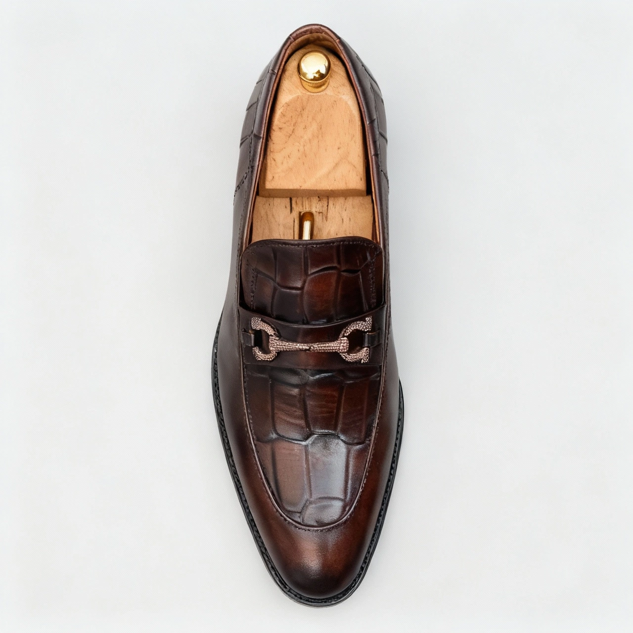 Discover the pinnacle of confident luxury with handcrafted leather shoes in Pakistan from Royal Moccs shoes. The Regent is a premier example of premium leather shoes, meticulously handmade from the finest full-grain genuine leather. This stylish brown leather shoe combines the timeless horsebit design with a bold, crocodile-embossed texture, finished in a vibrant, sun-drenched cognac brown that radiates quality.
