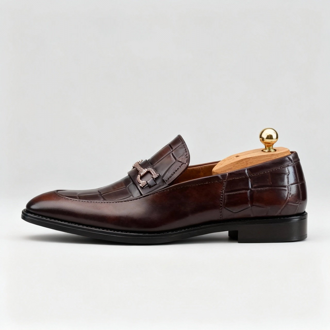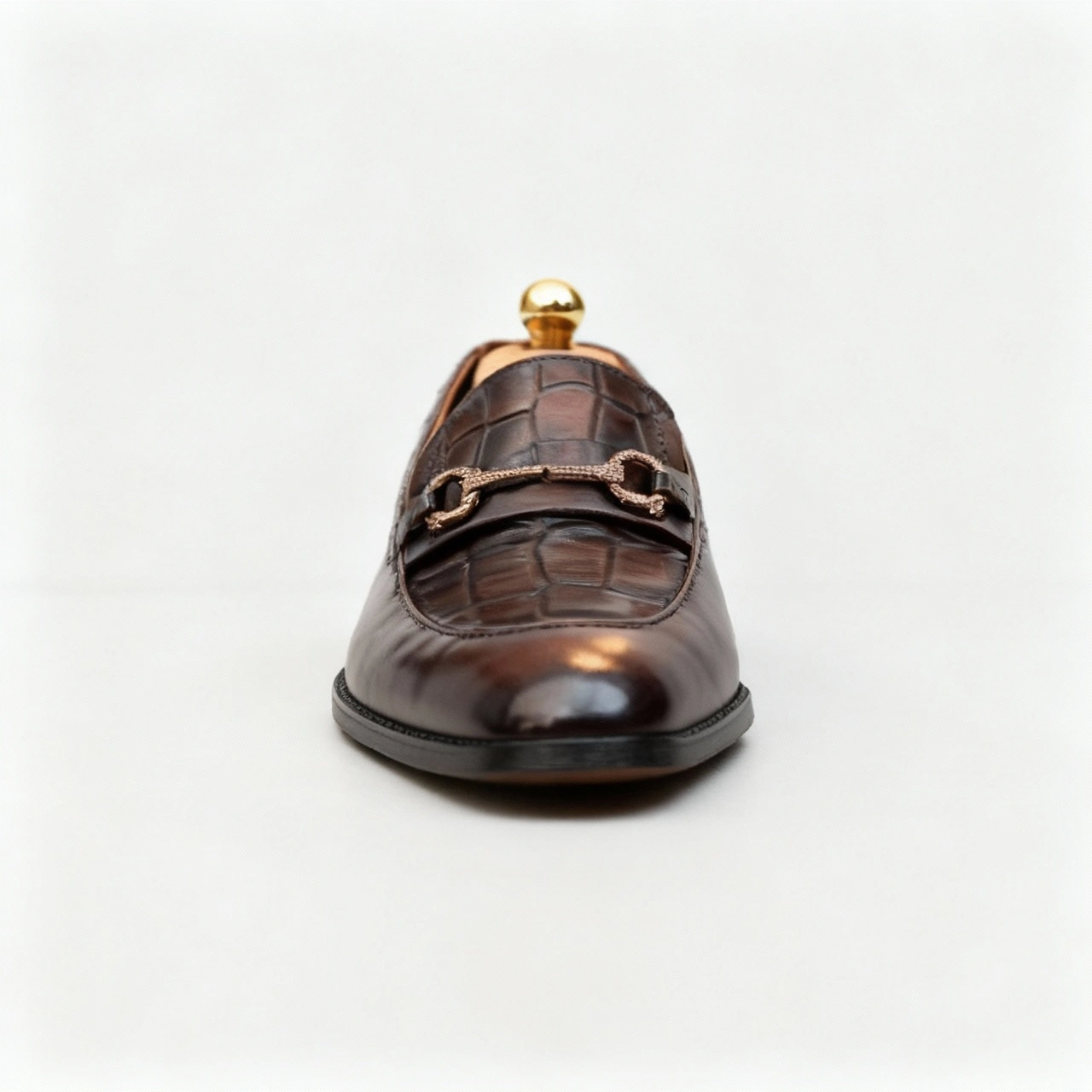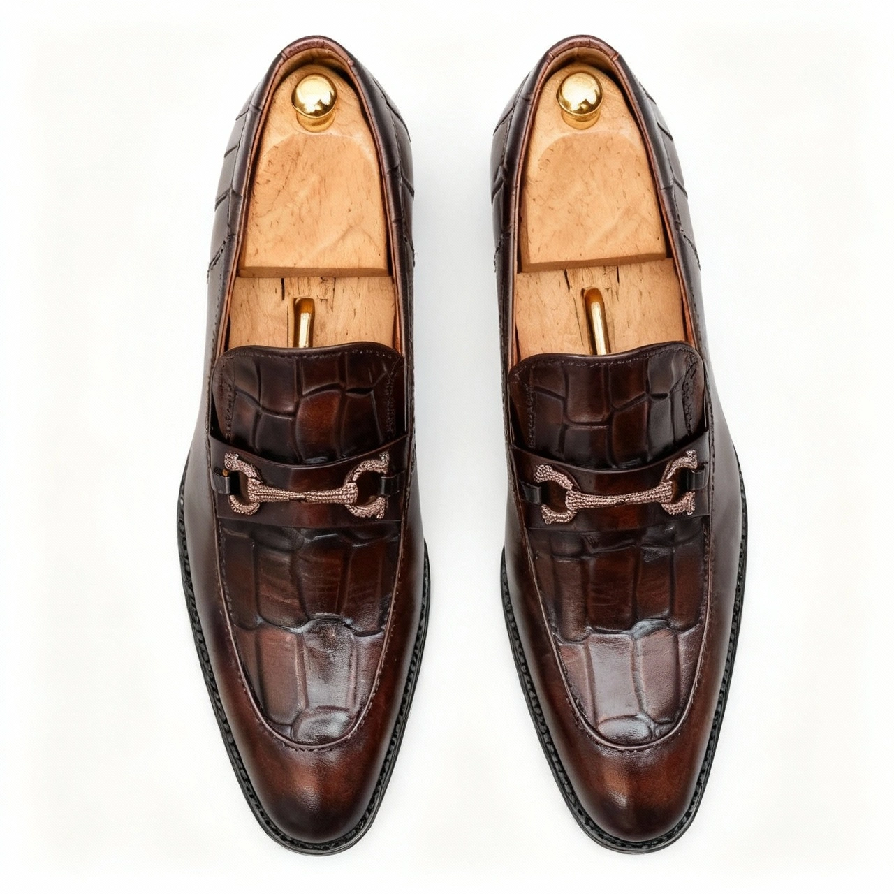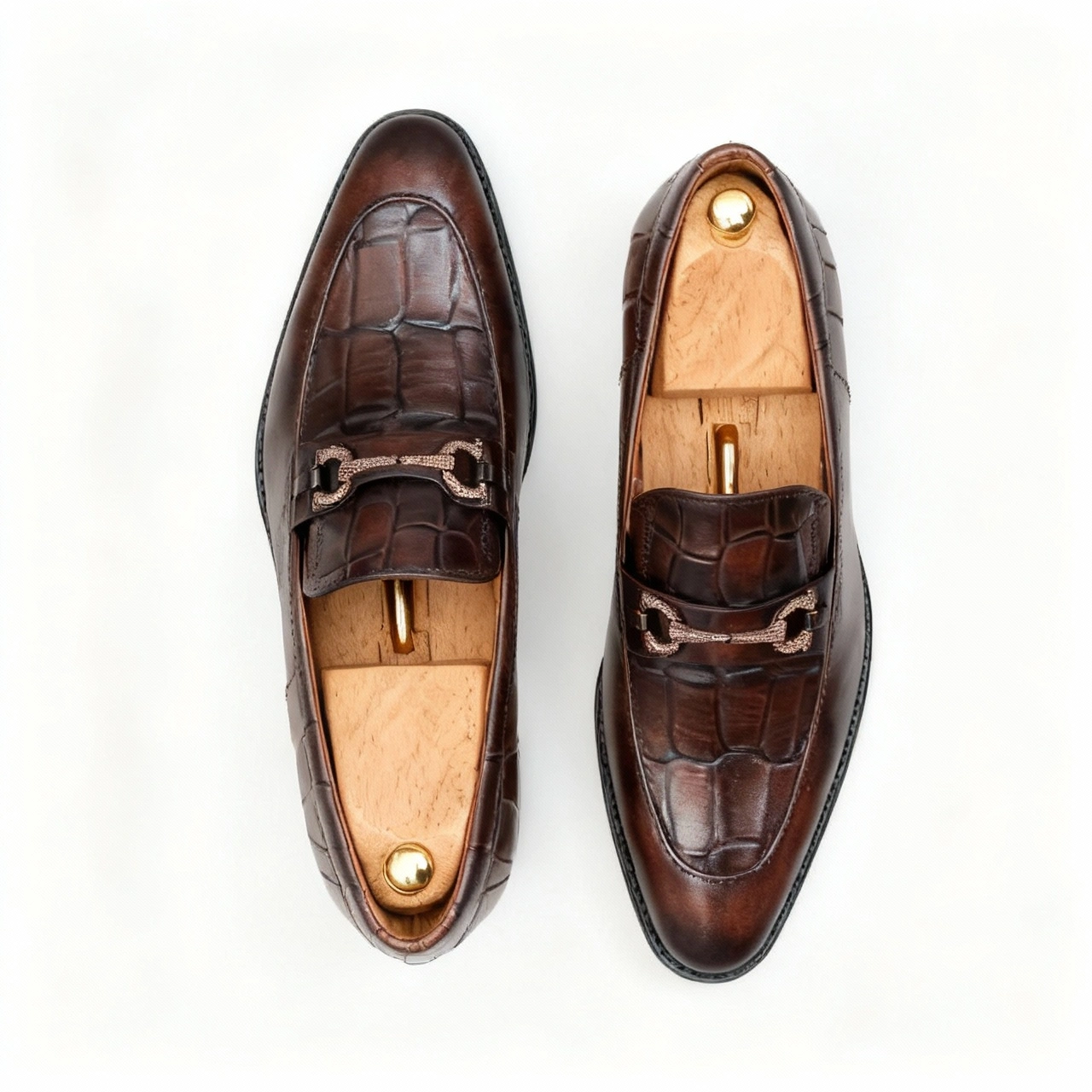 Design: Classic Loafer with a Crocodile-Embossed Finish and Textured Antique Gold Horsebit